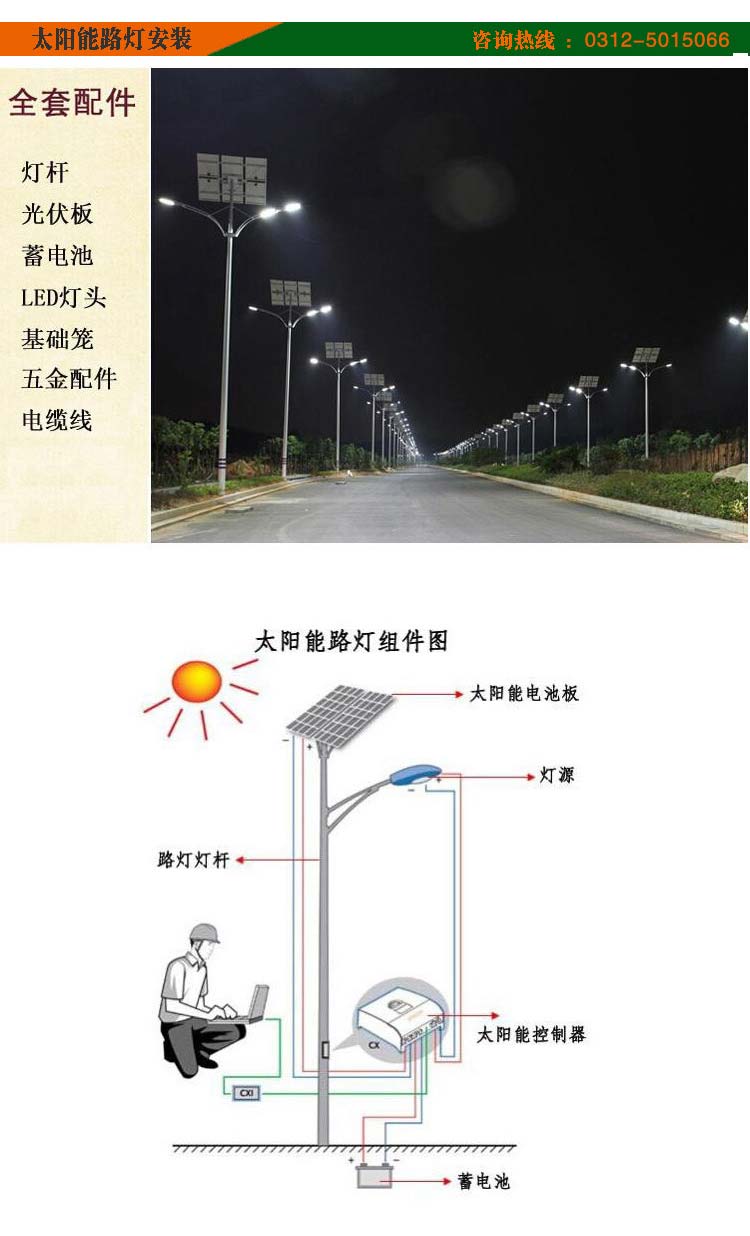 太陽能路燈led路燈燈頭W數(shù)、路燈燈桿高度、膠體蓄電池容量、太陽能電池板W數(shù)、照明時間,均可按照客戶要求定制,具體可溝通工作人員。